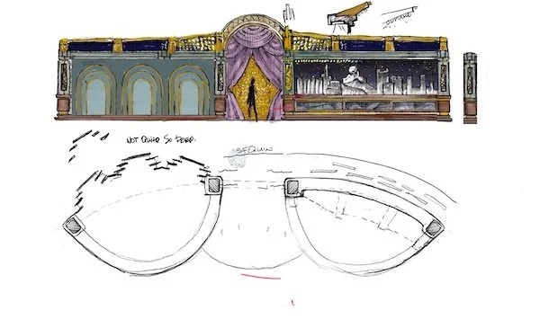 Tokarz’s ideation process follows the line of an idea from sketch to model to set, as seen in these images.