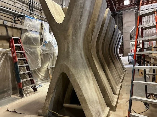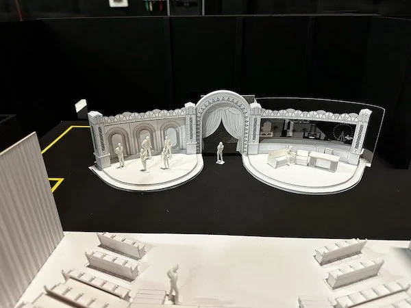 That meant re-creating those massive concrete Xs — which are 3D and sculptural — without being able to measure them accurately in person, since they were unreachable from inside the space. One of my set designers, Xi Yang, built the 3D model, the other, Darcy Prevost, 3D printed them and built them into a physical white model to make sure it would all work. We then used a printed photo backing to replicate the view of downtown L.A. We had to design, approve, and build the whole thing in under four weeks. Normally, it would take twice that long.