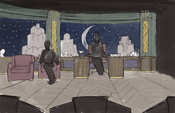 It always starts with the drawing. If I’m not happy with how something looks on paper, I can’t move forward. Once I’ve nailed the look and feel, I start thinking through the practical needs: camera angles, blocking, the director’s style. Luckily, on Hacks, we have mostly the same directors in Lucia and Paul, and we’ve had the same DP, Adam Bricker, for a long time, so I know how they like to shoot. That helps me prioritize what the camera will really see and where I can put the most energy. But there can always be surprises and happy accidents.