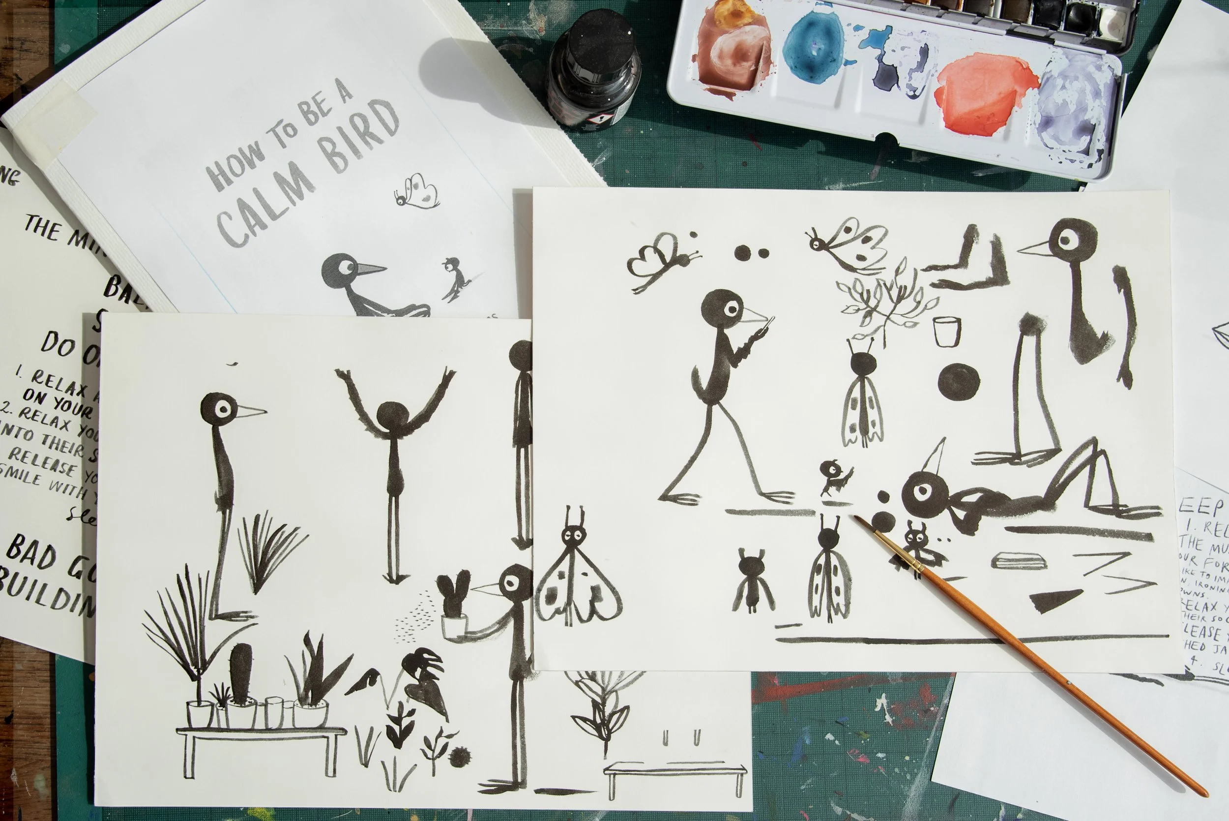 More stiff birds. One of the books I’ve had in my head for some time is about Bob, the genderless bird. He’s the same character from Yoga for Stiff Birds, something I wrote because I’d started doing yoga and it was hard and it used to make me cry. I was a stiff bird. So I made an instructional book with this character as an entry-level yoga guide. The book I’m working on now is going to be called Calm for Busy Birds, and it’s about secular Buddhism and mindfulness, which is a big part of my life that I’ve never really put it into my work before. It’s quite a challenge because I’m rereading lots of things and realizing, oh, yeah, I use mindfulness a lot in my work. In fact, it’s not dissimilar to the same formula that I use to help people make art, or to help people exercise. It’s like, you have a lot of complicated information, and it’s about trying to personalize that information and make it accessible and put it out there. Of course, that book is still a big lump of play at the moment.