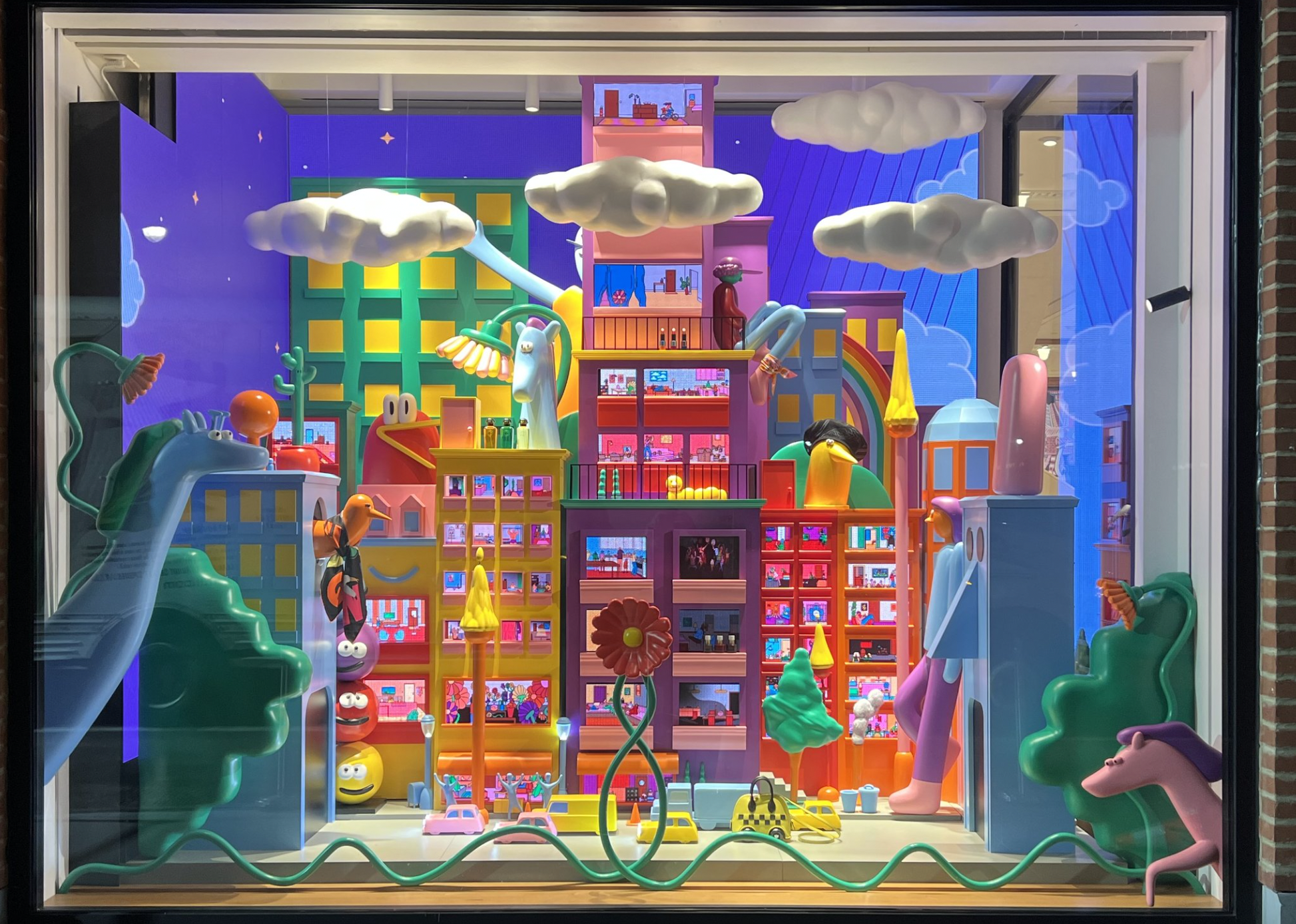 Perry’s work for Hermès is whimsical and oh-so-cool. Ilustration above and window display below.